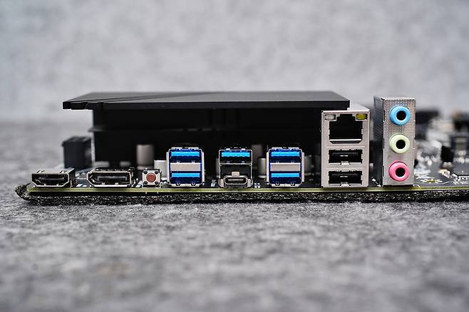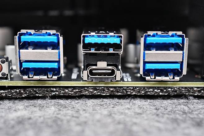 후면 포트입니다. USB포트가 C타입까지 포함하여 총 8개가 제공 됩니다. 상단 6개의 포트는 USB3.2 Gen2 버전으로 C타입 포트는 최대 10Gbps까지 지원합니다.