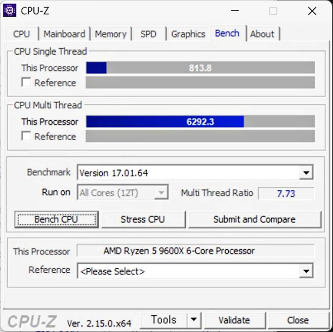 CPU-Z 벤치마크에서는 멀티코어 점수는 6292.3점 싱글코어 813.8점으로 측정 되었고, 시네벤치에서는 멀티코어 점수는 15,501점 싱글코어 2,139점으로 측정 되었습니다.