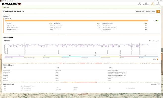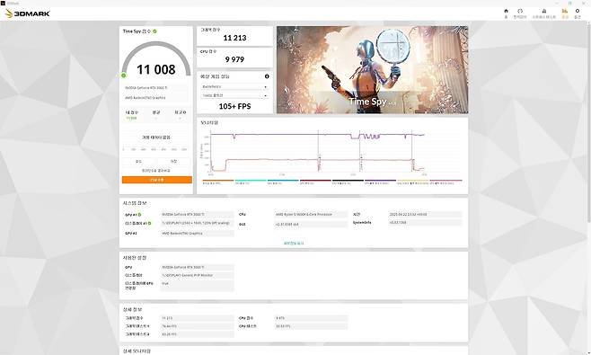 3D MARK 와 PC MARK 벤치마크 프로그램 점수입니다. 타임스파이 11,008점 파이어스트라이크 27,092점 PCMARK10 8,795점으로 측정되었습니다.