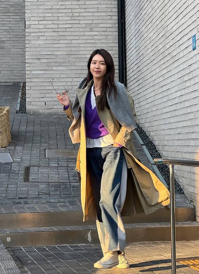 공개한 사진에서 채정안은 감각적인 레이어드 트렌치 코트룩을 완성했다.