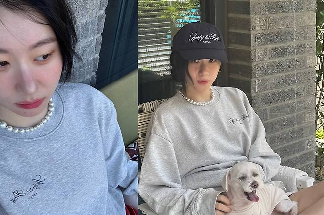 특히 포인트로 더해진 진주 목걸이는 편하기만 한 캐주얼 스타일에 고급스러운 무드를 더해줘 소소하지만 확실한 스타일 포인트가 된 것 같습니다.