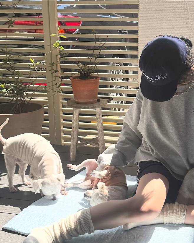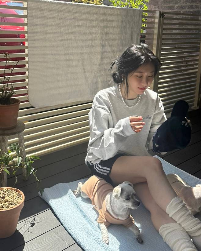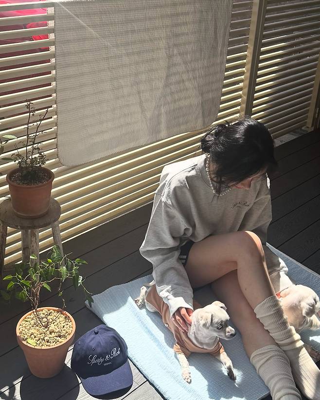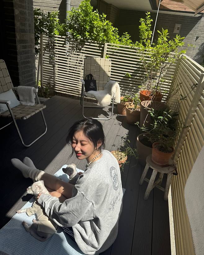 한 손엔 반려견, 다른 한 손엔 따스한 햇살을 끌어안은 듯한 모습에서 여유와 힐링이 느껴지네요.