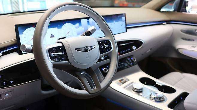 제네시스 GV70 페이스리프트는 최신 제네시스 브랜드 신차들과 마찬가지로 클러스터와 인포테인먼트 시스템을 하나로 합친 OLED 27인치 통합형 와이드 디스플레이와 터치 타입 공조 조작계를 탑재해 진보된 느낌을 부각하고 있으며, 도어트림 상단부에서 센터페시아로 이어지는 무드 램프와 크리스탈 디자인의 전자식 변속 다이얼(SBW), 제네시스 신규 엠블럼이 부착된 혼 커버, 투톤 색상의 신규 스티어링 휠, 정교한 스티치 디테일 등으로 실내의 고급감을 향상시켰습니다.