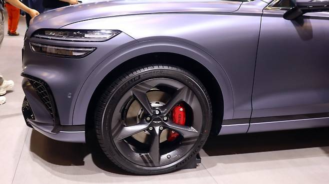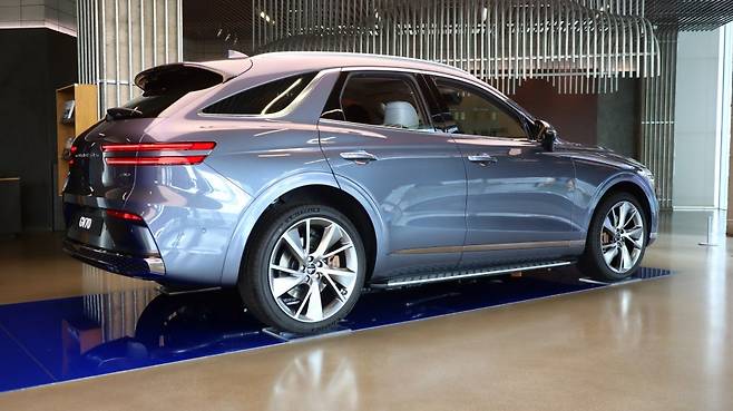 GV70 스포츠 패키지 측면부는 새로운 디자인이 적용된 두 종류의 휠을 통해 스포티한 느낌을 더욱 극대화 했으며, 21인치 다크 메탈릭 휠은 5개의 스포크가 림과 맞닿은 부위에 블랙 색상의 두 줄을 새겨 제네시스만의 존재감을 나타냈으며, 19인치 다크 메탈릭 휠은 마감을 다르게 처리한 2개를 교차시켜 역동적인 분위기를 연출 했습니다.