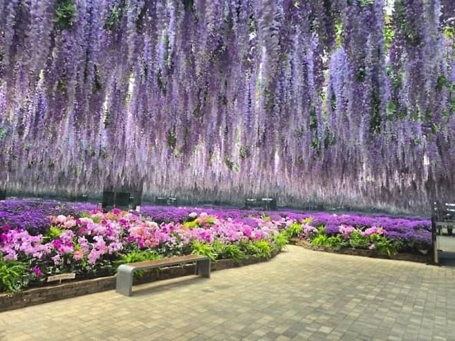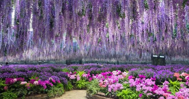 정원에 들어서면 가장 먼저 시선을 사로잡는 것은 천장과 바닥을 가득 채운 수만 송이의 베고니아 꽃입니다.