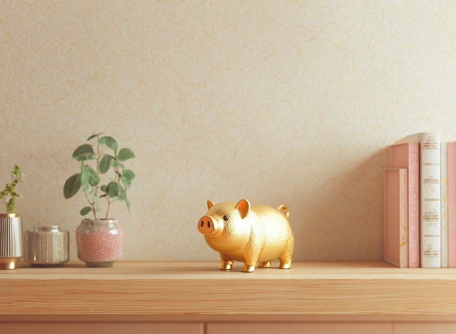 황금돼지 모양 소품이나 금색 촛대, 금속 재질의 트레이처럼 작은 물건을 한두 개만 포인트로 두면 공간에 무게 중심을 잡는 데 도움이 됩니다.