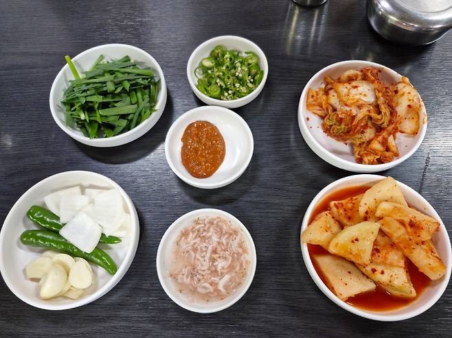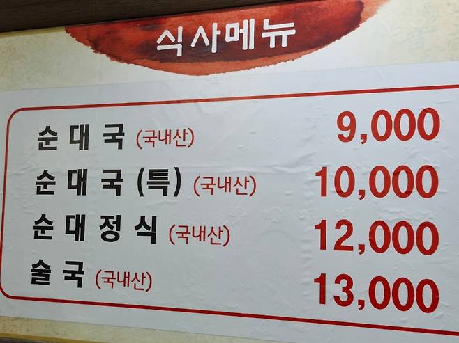 우선 벽에 걸린 메뉴판을 봤다. 순대국이 9천원이고, 순대 한접시는 6천원이다. 가성비 최고의 가격이다(우리가 사진을 촬영한 것은 일 년 전이라 지금은 금액이 1천원씩 올랐다.) 순대국을 주문하고 밑반찬이 깔렸다. 배추김치와 석박지, 부추, 찍어먹을 수 있는 양파와 고추, 마늘, 그리고 첨가해 먹을 수 있는 새우젓과 청양고추가 나왔다. 그리고 테이블마다 들깨가루와 국물이 가득 든 새우젓 용기가 있다.
