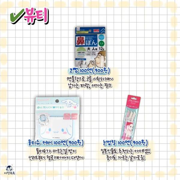 일본에도 다이소가 대중화되어 있는데요. 우리나라에서는 5,000원이 넘지 않는 가격에 제품들을 판매한다면, 일본은 100엔 샵이라고 하여 100엔으로 제품을 구입할 수 있도록 따로 존을 만들어 놓을 정도인데요. 오늘은 일본에 가면 다이소를 들려 무엇을 사야 하는지 쇼핑리스트를 알려드리겠습니다!