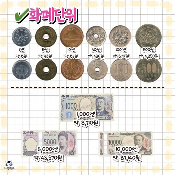 우리나라의 동전이 10, 50, 100, 500 단위의 4개라면 일본은 1엔과 5엔이 추가로 더 있습니다. 대중교통이나 식당에서도 대부분 동전을 이용하며 일본 여행 중에는 동전 지갑이 꼭 필요하다고할 정도입니다. 지폐만 한가득 들고 갔다가는 산더미처럼 쌓인 동전들을 보게 된다고 합니다.