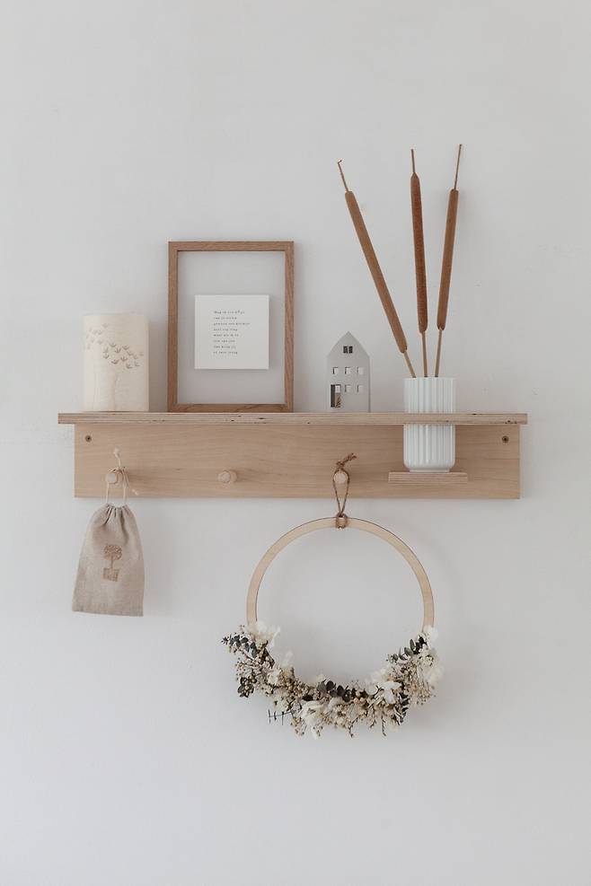 벽면 인테리어에는 우드 후크 선반이 제격이다. 리스, 마크라메, 액자, 캔들 등 다양한 오브제를 걸거나 올릴 수 있고, 주머니형 수납이나 마스크 걸이로도 활용된다. 기능성과 감성을 동시에 챙길 수 있는 실속 있는 인테리어 소품이다.
