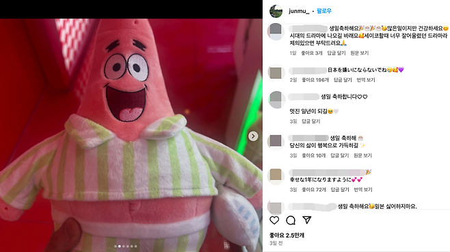 신문은 기사에서 TBS 드라마 '캐스터'에서 나가노 메이와 공연한 김무준이 생일 하루 뒤인 지난 25일 올린 글을 조명했다. 김무준은 "거짓말하지 마. 벌써 절반이 지났네. 생일 축하해 무준아"라는 글과 사진 몇 장을 게재했다.