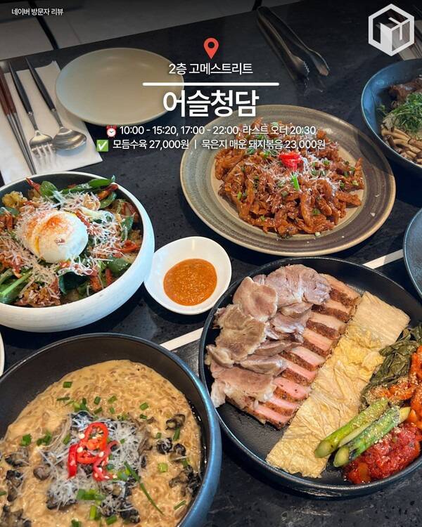 스타필드 수원 실내 데이트의 마무리는 어슬청담에서 조용하고 분위기 있는 한 끼로 완성해보세요. 모듬수육과 매콤한 묵은지 돼지볶음은 입맛을 돋우기에 충분하고, 좌석 간 간격이 넓어 대화에 집중하기 좋은 공간입니다.