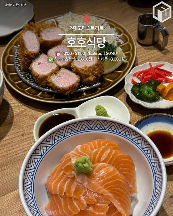 2층에 자리한 호호식당은 깔끔하고 정갈한 일본식 가정식을 맛볼 수 있는 수원 스타필드 맛집입니다. 특히 부드러운 히레가츠와 고슬고슬한 밥 위에 신선한 연어를 얹은 사케동이 인기죠.