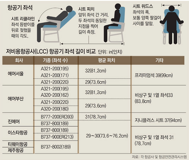 에어부산과 에어서울은 저비용항공사 중에서도 피치가 넓은 편인데요. 29~32인치 정도입니다. 사람들이 돈을 좀 더 주고라도 에어부산, 에어서울의 비행기를 탄다는 말이 있을 정도이죠.