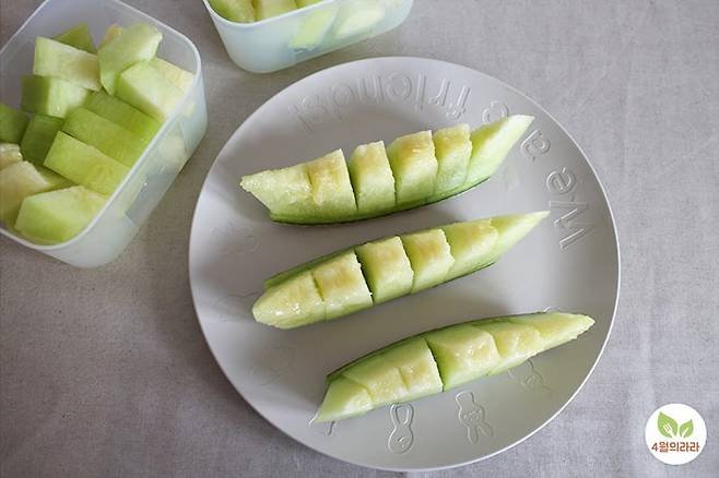 – 겉 껍질을 살려, 먹기 좋은 크기로 자른다(꼬지 사용 시 모양 유지).