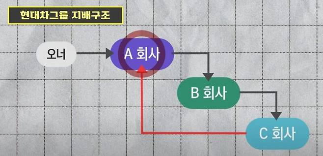현대차그룹은 현재 '순환출자' 구조로 지분 관계가 이뤄져 있습니다. 지배구조의 정점엔 현대모비스가 있고요. 그 밑에 현대차, 더 밑에 기아로 이어지는데 기아가 현대모비스의 지분을 또 가지고 있습니다. '현대모비스-현대차-기아-현대모비스'로 이어지는 상호 출자의 관계인 겁니다.