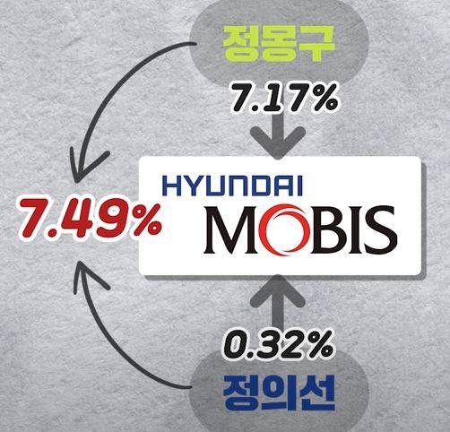 좀 더 현실적인 문제는 정의선 회장의 현대모비스 지분이 0.32%에 불과하다는 겁니다. 병석에 앉은 부친 정몽구 명예회장의 지분(7.17%)을 물려받아도 현대모비스 지분율이 7.49%에 불과하죠. 다시 말해 200조원을 훌쩍 넘는 국내 자동차 최대그룹을 단 8%의 지분으로 이끌고 있는 겁니다.