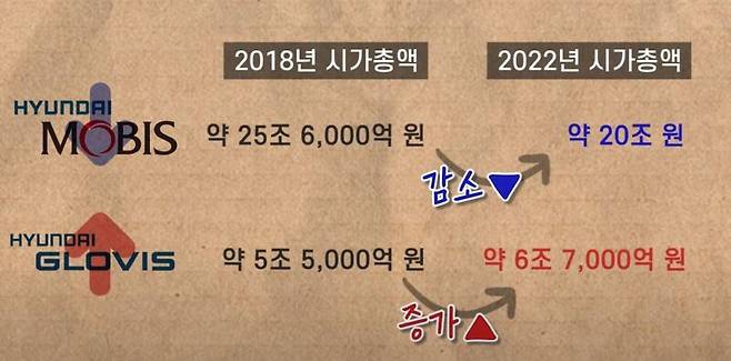 26일 종가 기준 현대모비스의 시가총액은 20조1000억원, 현대글로비스는 6조7000억원 수준입니다. 지배구조 개편을 시도했던 2018년 시가총액 대비 현대모비스 주가는 22% 줄었고, 반면 현대 글로비스는 22% 올랐죠.