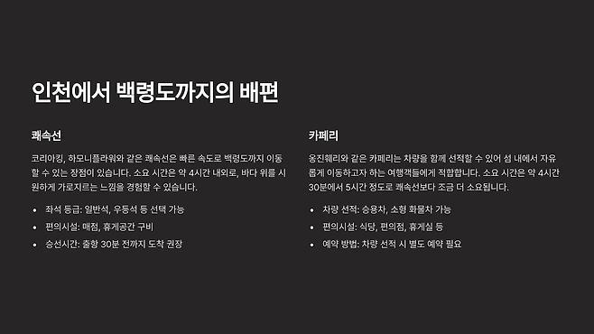 코리아킹, 하모니플라워와 같은 쾌속선은 빠른 속도로 백령도까지 이동할 수 있는 장점이 있습니다. 소요 시간은 약 4시간 내외로, 바다 위를 시원하게 가로지르는 느낌을 경험할 수 있습니다.