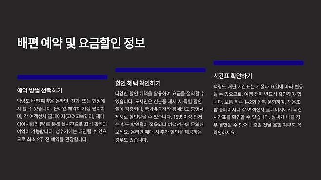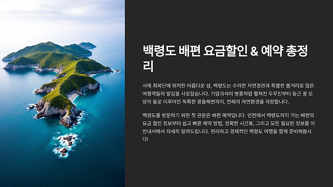 백령도를 방문하기 위한 첫 관문은 배편 예약입니다. 인천에서 백령도까지 가는 배편의 요금 할인 정보부터 쉽고 빠른 예약 방법, 정확한 시간표, 그리고 모든 필요한 정보를 이 안내서에서 자세히 알려드립니다. 편리하고 경제적인 백령도 여행을 함께 준비해봅시다!