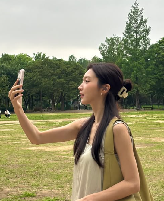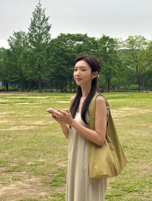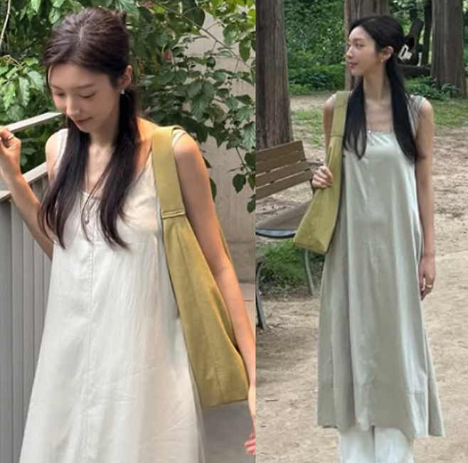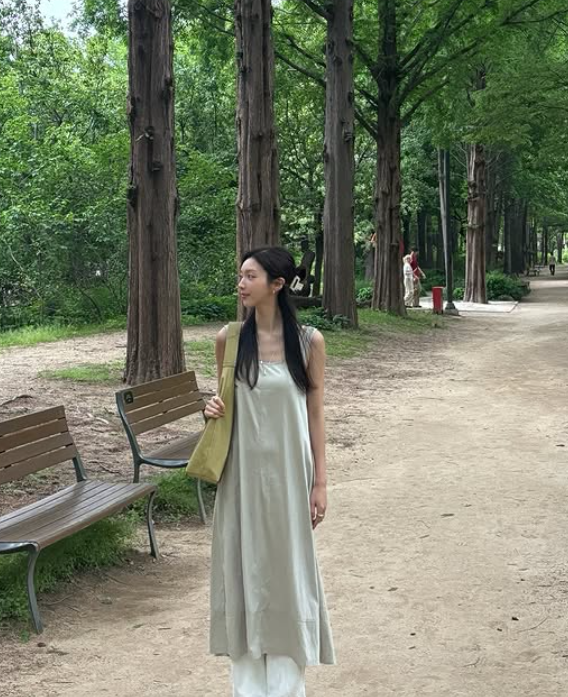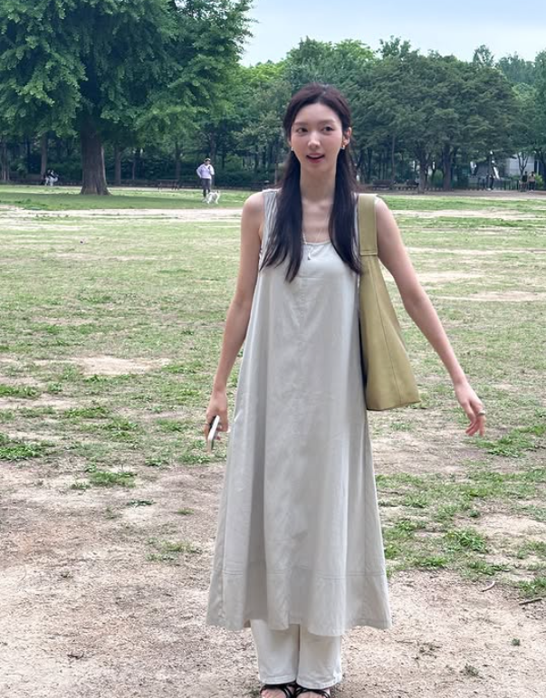 채서진 님이 선택한 민소매 롱원피스는 편안하면서도 우아한 분위기를 자아내며, 민소매 디자인이 여름에 시원한 느낌을 더해주었죠. 간결한 디자인이지만 그 자체로 충분히 세련된 매력을 발산하며, 청순한 이미지와 잘 어울렸어요.