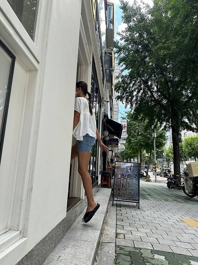 데님 쇼츠와의 매치는 꾸민 듯 안 꾸민 듯한 ‘꾸안꾸’의 정석이다. 쇼츠의 올 풀린 밑단 디테일은 캐주얼한 감각을 배가시키며, 편안한 플랫 슬리퍼와 자연스럽게 이어진다. 길게 뻗은 다리 라인에 적당한 여유감을 준 블라우스 실루엣 덕분에 전체적으로 부담스럽지 않으면서도 산뜻한 여름 룩이 완성됐다.