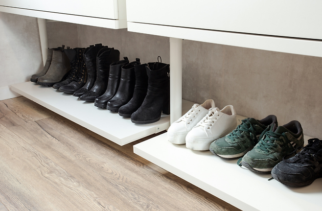 검은 신발이 많다면 색을 섞어 배치하거나 계절별로 분리해 보관하는 것도 방법입니다.