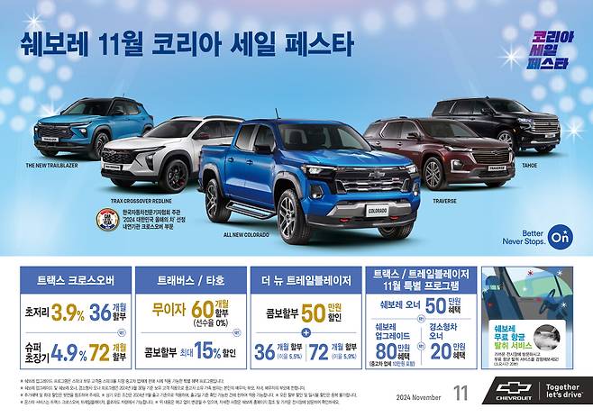 현금할인에 할부 프로그램을 결합한 '콤보할부'도 이어간다. 2025년 트레일블레이저의 경우 50만원 할인 후 5.5% 36개월 또는 5.9% 72개월 조건으로 구매 가능하다. 신차 올 뉴 콜로라도는 6.0% 72개월 할부판매한다. 트래버스는 선수금 없이 최장 60개월 무이자 할부조건을 제시하고, 특정 색상·트림 선택 시 50만~100만원 추가 할인한다. 타호의 경우 60개월 무이자 할부, 일시불 구매 시 400만원 할인 조건이다. GMC 시에라도 다양한 할부조건에 색상별 50만~150만원 할인혜택을 신설했다.