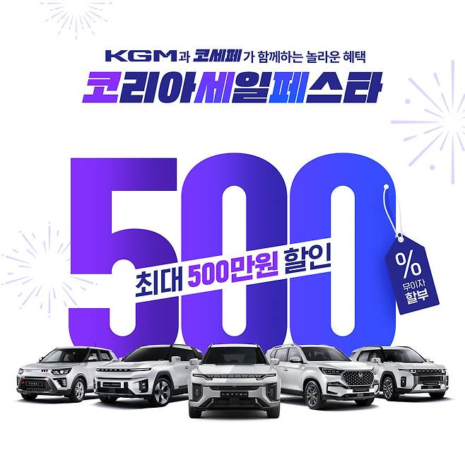 KGM은 렉스턴 써밋에 500만원을 지원한다. 더 뉴 토레스는 어라운드뷰 모니터링 시스템 무상 지원에 유류비 50만원까지 더해 최대 300만원의 혜택을 제공한다. 전기차 모델인 토레스 EVX에는 3D 어라운드뷰 모니터링 시스템 무상 지원에 100만원 추가할인을, 코란도 EV에는 350만원의 혜택을 제공한다. 이 외에도 다양한 할인 혜택 및 할부 프로그램을 진행한다. 액티언과 더 뉴 토레스(밴 포함)는 선수금 없는 12개월 무이자 할부를 제공한다.