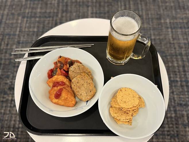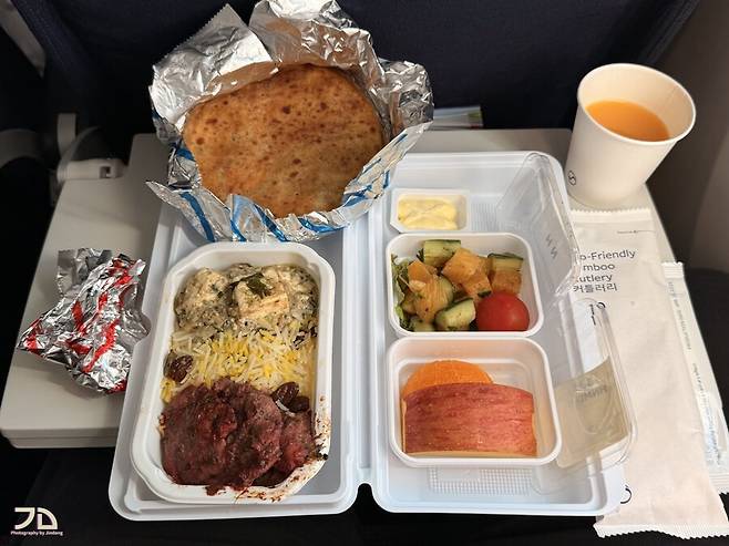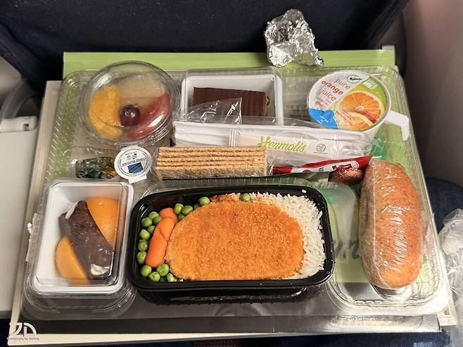 일반 기내식과 달리 양이 엄청 많습니다. 에피타이저로 과일 칵테일, 빵과 비스킷, 메인 요리, 두 종류의 디저트, 초콜렛, 오렌지 쥬스까지. 이코노미 좌석은 테이블이 작아서 아예 별도의 식판을 받쳐서 줘야 할 정도로 큽니다.