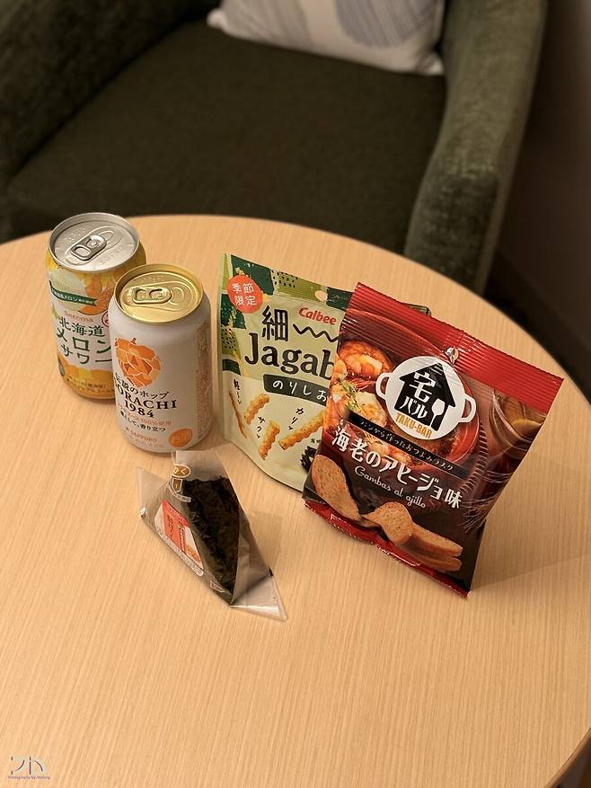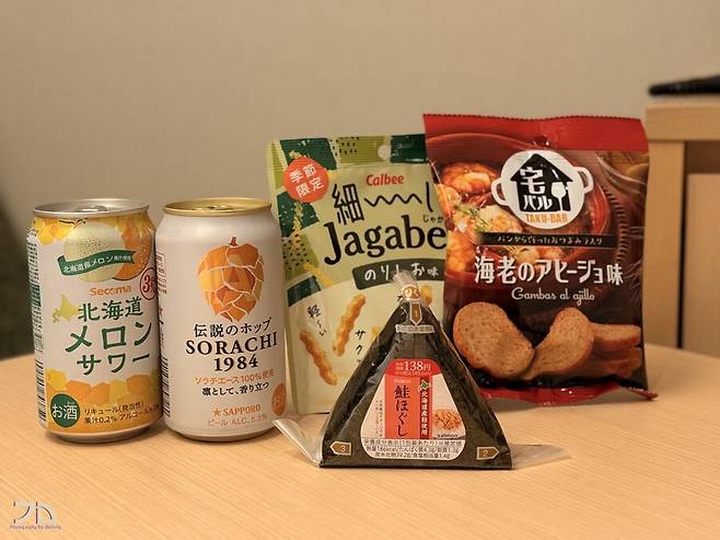 오늘의 야식은 북해도 로컬 편의점인 세이코마트에 파는 북해도 멜론사와, 소라치1984 캔맥, 적당히 고른 과자, 연어삼각김밥.