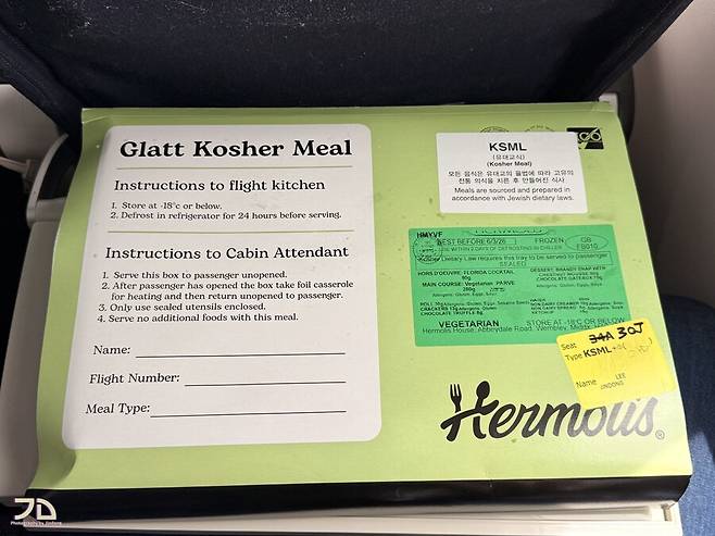 코셔 기내식의 특징은 아무 회사에서나 만들지 못하고 반드시 지정된 회사에서 만들어 냉동으로 운송하는 제품만 제공된다고 합니다. 또 율법에 따라 먹는 사람이 직접 확인해야 한다고 해서, 이륙하기 전에 승무원이 박스를 들고 와서 확인시켜줍니다. 저는 유대교인은 아니기 때문에 뜯어서 데워달라고 부탁드렸습니다.