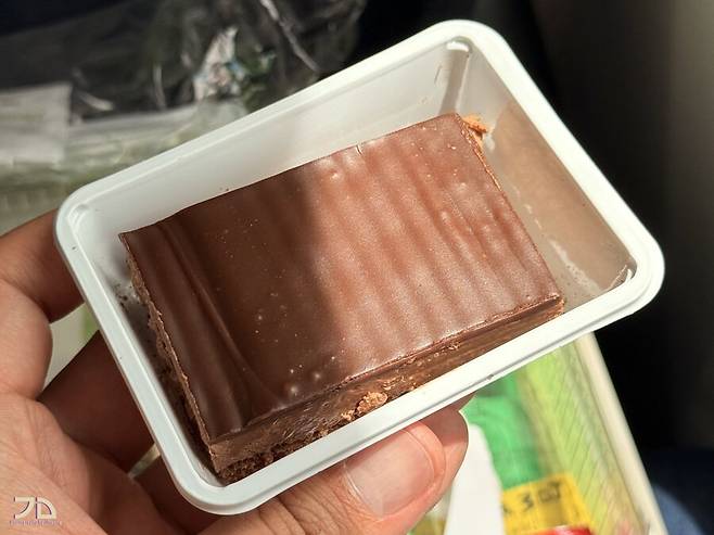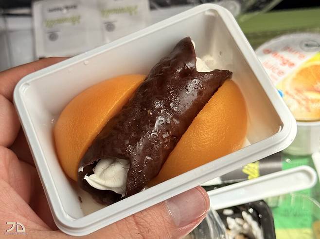 디저트가 2개나 들어있습니다. 절인 과일과 초코롤, 그리고 초코케이크. 에피타이저부터 빵, 메인요리까지 먹었을 때 이미 일본행 같은 단기 기내식과 비슷한 양인데, 거기에 디저트가 2개나 추가되고, 꽤 달달하고 맛있습니다.