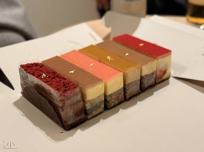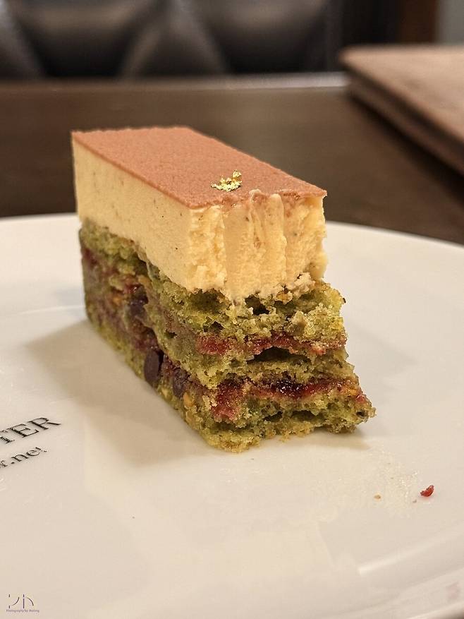 제가 먼저 고른건 Monstre. 칼피스 버터와 마스카포네 치즈가 윗쪽에 크림층을 이루고, 아래쪽은 피스타치오와 프랑부아즈 잼이 결합된 케이크입니다. 작지만 묵직하고 굉장히 맛있었습니다.