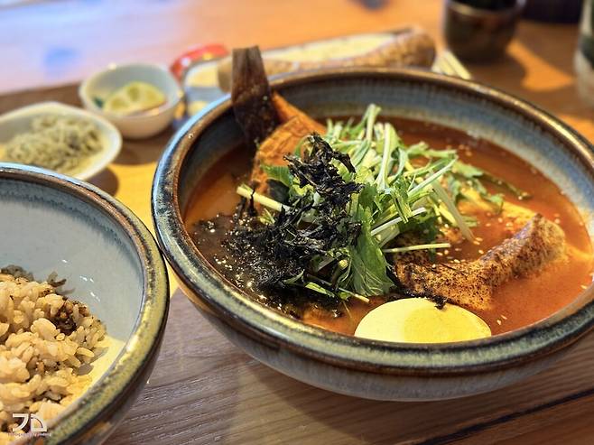 옵션을 제외하고 메인 자체는 괜찮았습니다. 국물이 마치 이름만 스프카레이고 해물 보양탕(?)을 먹는 듯한 느낌에. 토핑으로도 생선이 반마리 정도 들어있습니다. 함께 나오는 다시마 가루와 가쓰오부시는 국물을 좀 먹다가 중간에 섞어주면 또 다른 맛으로 변모합니다. 스프카레가 인도의 카레를 한번 북해도식으로 변주한 음식이라면, 여기는 그 스프카레를 한번 더 일본식으로 변주한 느낌입니다.