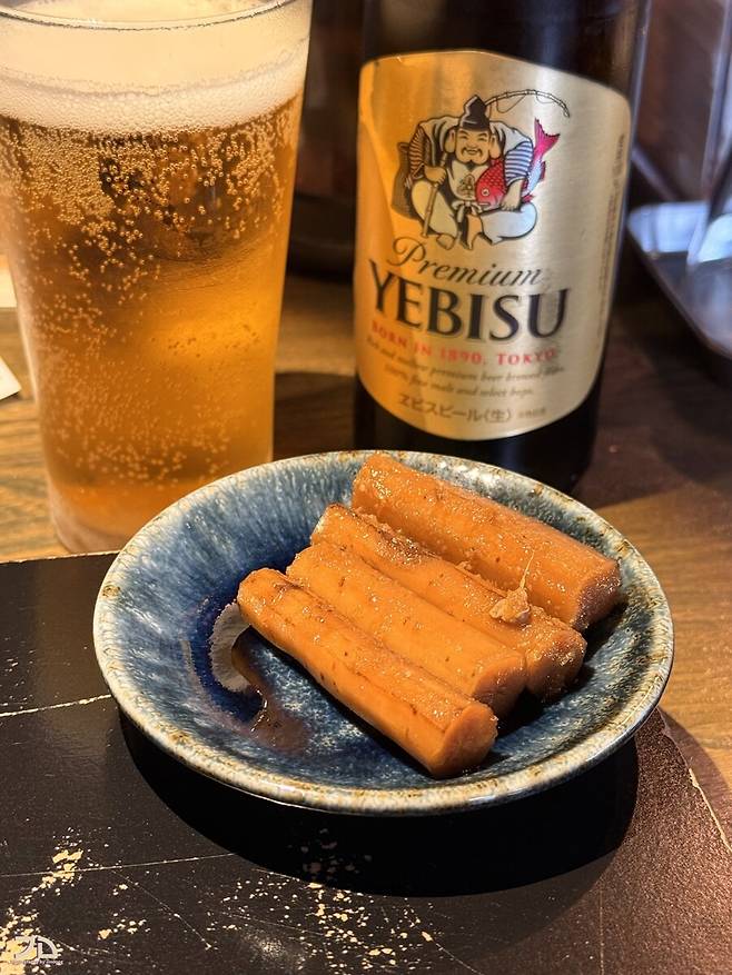 맥주는 에비스 프리미엄 병맥주가 나오고, 서비스로 우엉조림이 나옵니다.