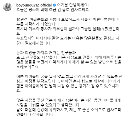 서울시 어린이병원 외에도 박보영은 다양한 곳에 꾸준히 기부해왔다.