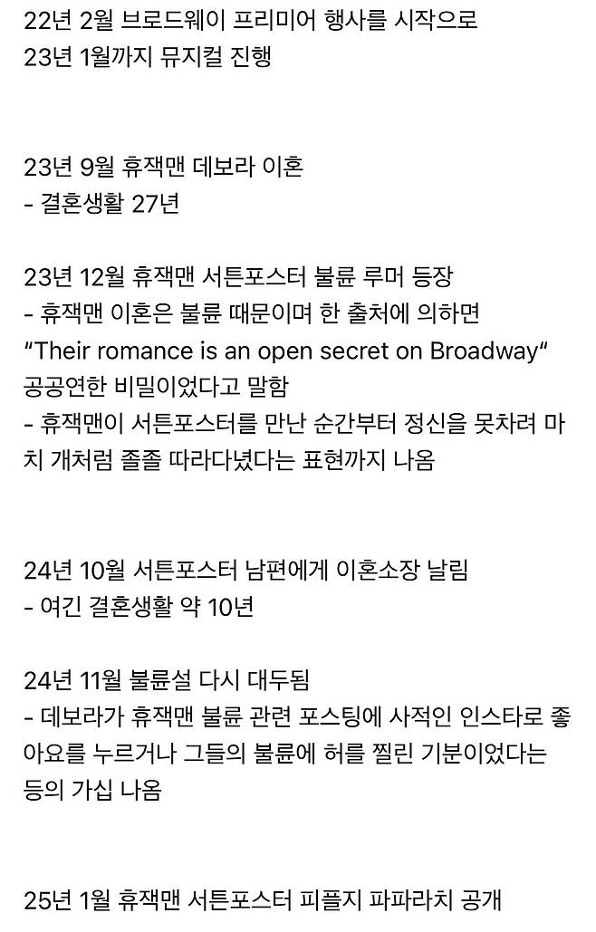 “브로드웨이에서는 많은 사람들이 알았지만, 두 사람 모두 정말 좋은 사람들이라 우리는 이를 조용히 지켰어요. 모두 그들의 사생활을 존중했죠. 하지만 불륜과 그로 인한 중첩이 있었어요. 지금 그들은 정말 행복해요.”