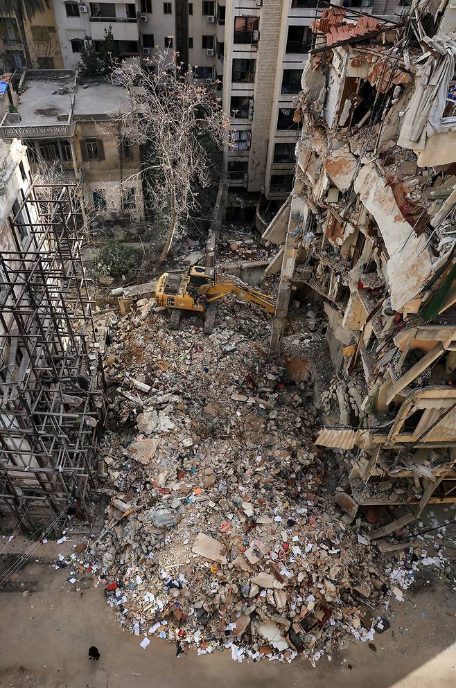 | ▲ 지난 8일 이스라엘의 공습을 당한 레바논 베이루트의 아인 알 무라이세 현장에서 9일 중장비가 가동되고 있다. |