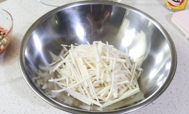 절인 콜라비에서 나온 물을 가볍게 짜서 준비해 주세요.