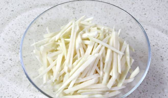 콜라비 껍질을 감자칼이나 칼로 벗기고 얇게 채 썰어 주세요. 너무 얇지 않게 썰어야 아삭한 맛이 살아납니다.