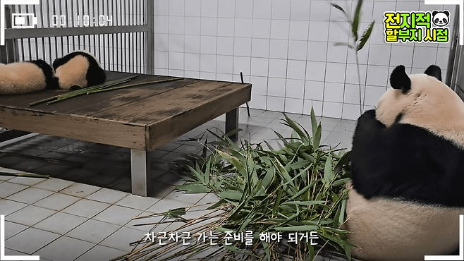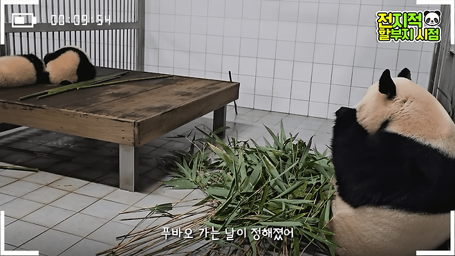 애교를 부리던 러바오는 "대나무 좀 먹고 편하게 자" 라는 강바오의 말에 방 안쪽으로 들어갔습니다.