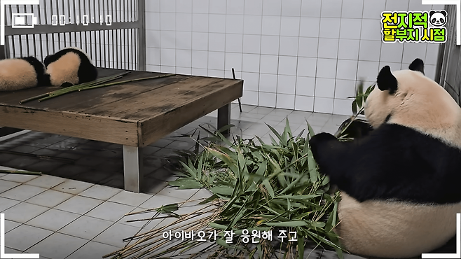 애교를 부리던 러바오는 "대나무 좀 먹고 편하게 자" 라는 강바오의 말에 방 안쪽으로 들어갔습니다.