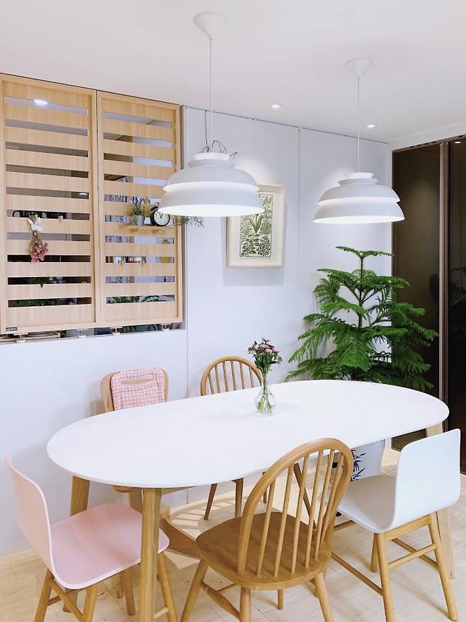 다이닝 공간의 벽면은 이사 오면서 가벽을 설치하고 필름 작업을 했어요.그리고 천정에 레일을 설치해서 액자를 걸 수 있게 만들었어요.액자만 바꿔주어도 공간의 분위기가 달라지기 때문에 자주 바꿔주는 편이에요