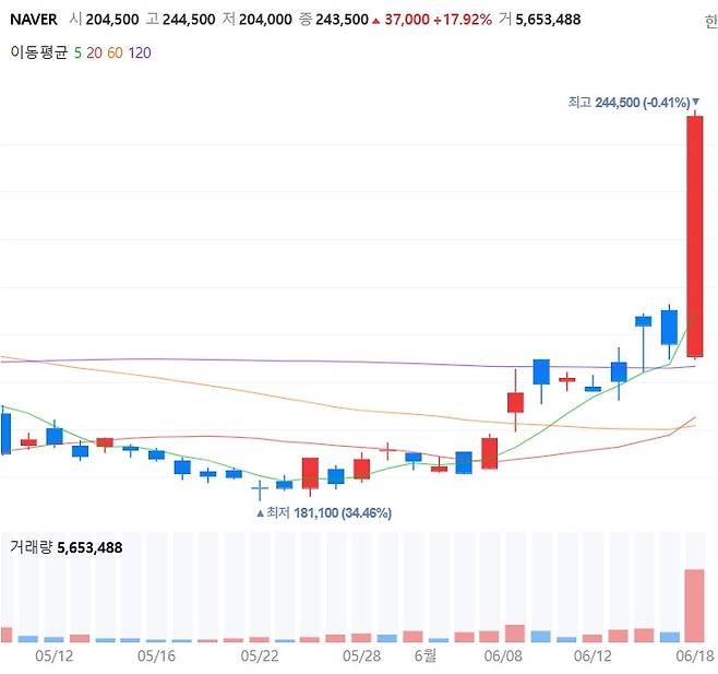 18일 한국거래소에 따르면, 이날 네이버는 전날 대비 17.92% 오른 24만 3500원에 정규장 거래를 마감했다. 네이버가 24만 원대를 회복한 것은 지난 2022년 8월 이후 약 2년 10개월 만인 것으로 알려졌다.