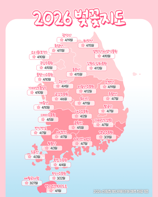 2026년 역시 남부 지방에서 시작된 봄꽃 개화가 점차 중부와 북부로 확산될 것으로 예상됩니다. 여행톡톡에서는 2026 봄꽃 개화지도와 함께 지역별 개화시기와 벚꽃 만개시기, 그리고 봄 여행지로 추천하는 명소까지 정리했습니다.