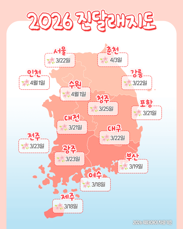 이어 진달래 개화시기 역시 남부 지역부터 시작됩니다. 제주와 여수는 3월 18일, 부산은 3월 19일, 포항은 3월 21일, 대전과 강릉은 3월 21일~22일, 대구와 서울은 3월 22일, 광주와 전주는 3월 23일로 예상됩니다.