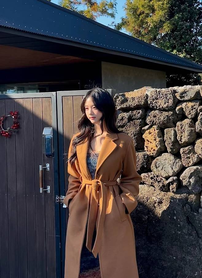 공개한 사진에서 재시는 화려한 크로셰 니트 원피스 위에 카멜 코트를 걸친 여행룩으로 여신 같은 미모를 드러냈다.