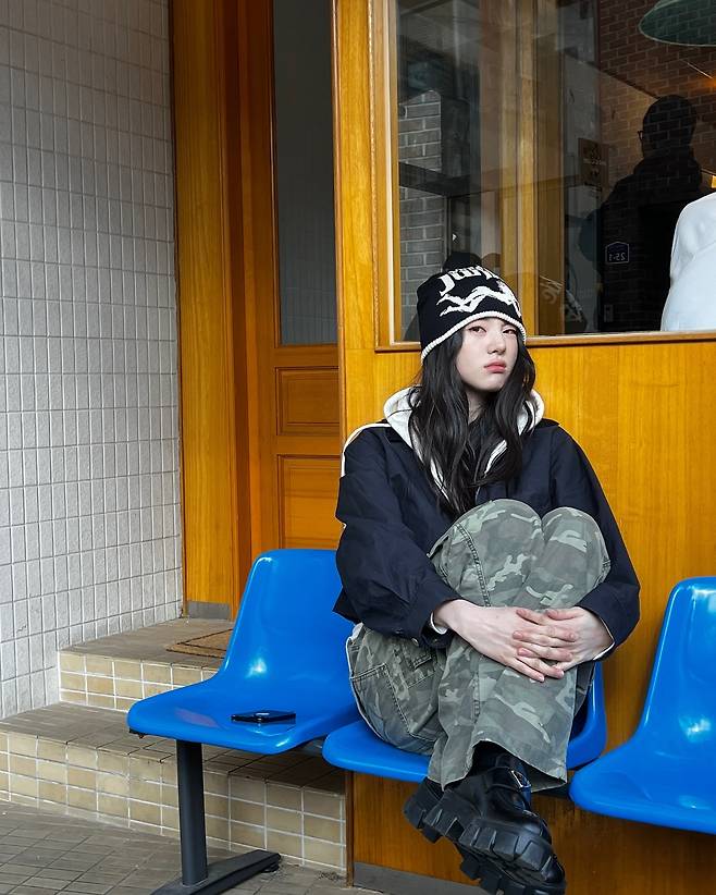 블랙과 크림 조합의 비니로 시선을 집중시키고, 두툼한 후드 집업과 크롭 재킷을 레이어드한 상의가 매력을 극대화했어요.