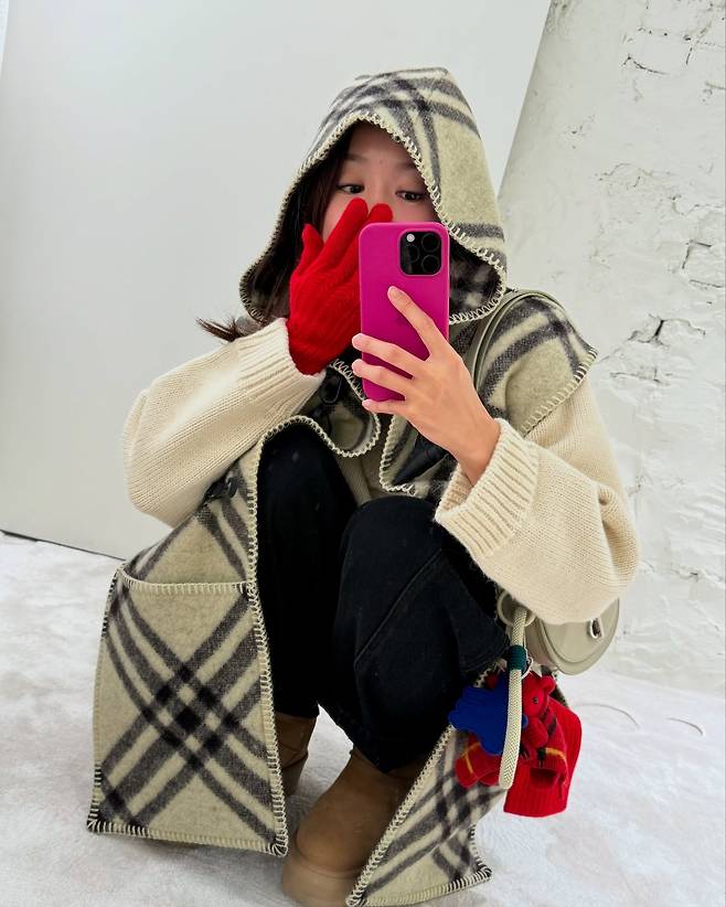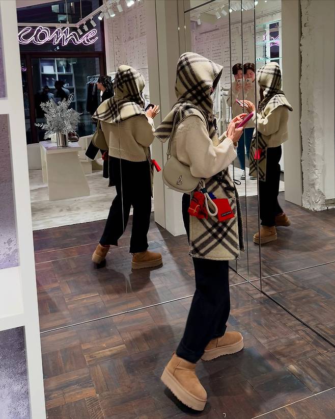 패셔니스타로 유명한 배우 이시영은 아이보리 니트에 버버리 니트조끼와 어그부츠를 매치해 러블리한 겨울 패션을 완성했습니다.